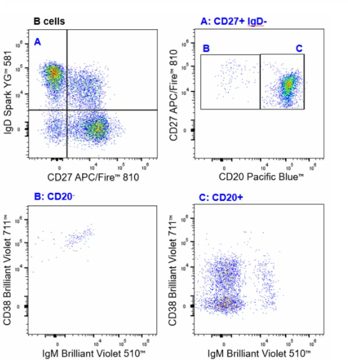 Human peripheral blood mononuclear cells were stained with the Human General Phenotyping (26c) panel. CD27+ IgD- memory B cells (A, top right) were further distinguished as CD20- plasmablasts (B, bottom left) and CD20- memory B cells (C, bottom right). All data were gated on CD45+ CD19+ CD3- TCRγ/δ- viable single cells within the lymphocyte population.