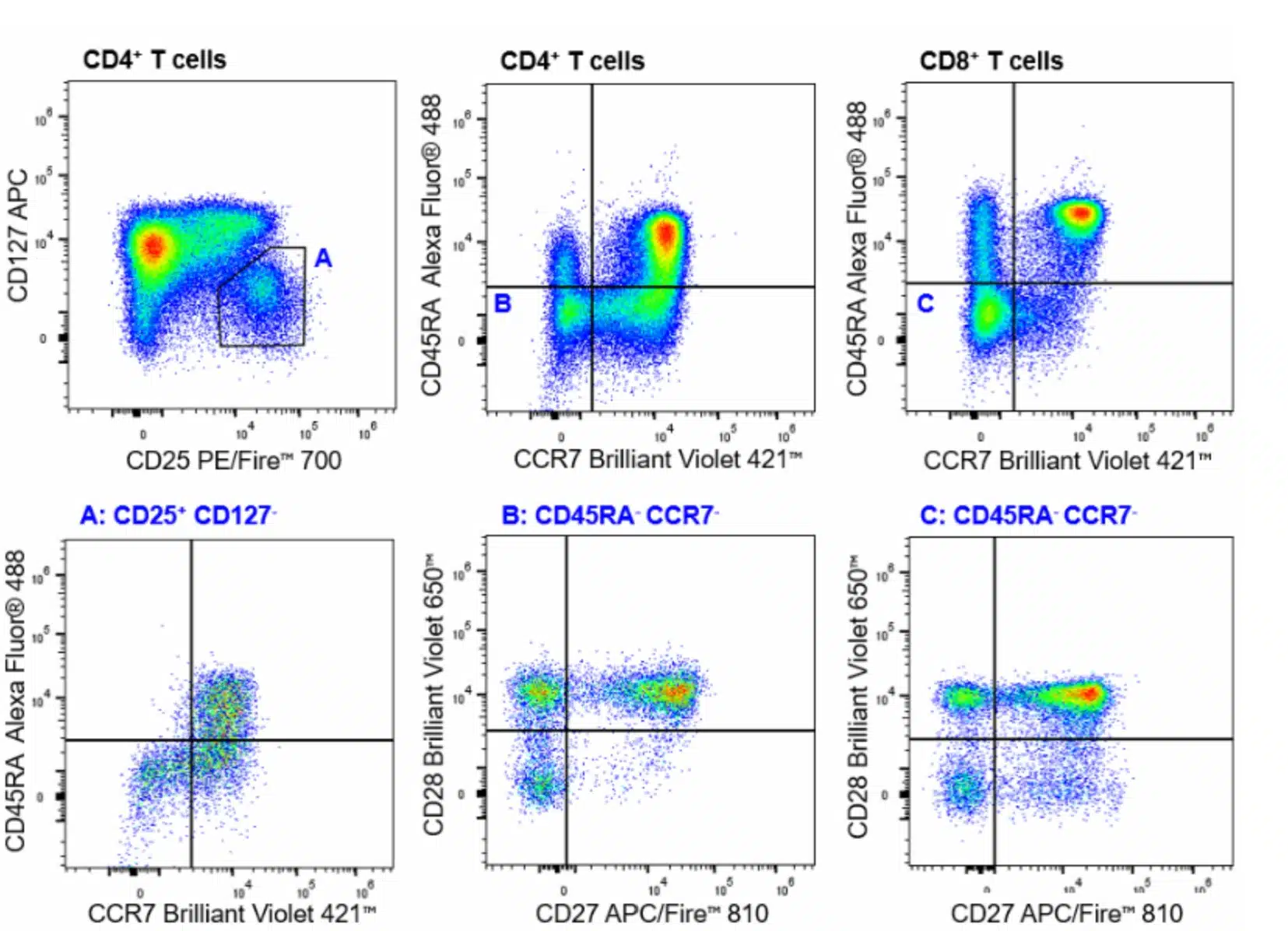 Human peripheral blood mononuclear cells were stained with the Human General Phenotyping (26c) panel. CD4+ T cell subsets, including CD25+ CD127- Tregs (A, bottom left) and CD45RA- CCR7- effector memory T cells (TEM) (B, bottom middle) are shown. CD8+ T cell subsets, including CD45RA- CCR7- effector memory T cells (TEM) (C, bottom right) are also shown. All data were gated on CD45+ CD3+ TCRγ/δ- CD56- viable single cells within the lymphocyte population.