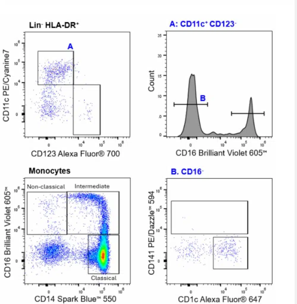 Human peripheral blood mononuclear cells were stained with the Human General Phenotyping (26c) panel. Dendritic cells (DCs) were identified as CD45+ HLA-DR+ TCRγ/δ- CD3- CD56- CD19-- cells in the lymphocyte gate (top left). Classical DC subsets are further analyzed (top right and bottom right). Non-classical (CD14-CD16+), intermediate (CD14⁺CD16⁺), and classical (CD14+CD16-) monocytes are shown as viable CD45+ single cells within the monocyte population (bottom left).
