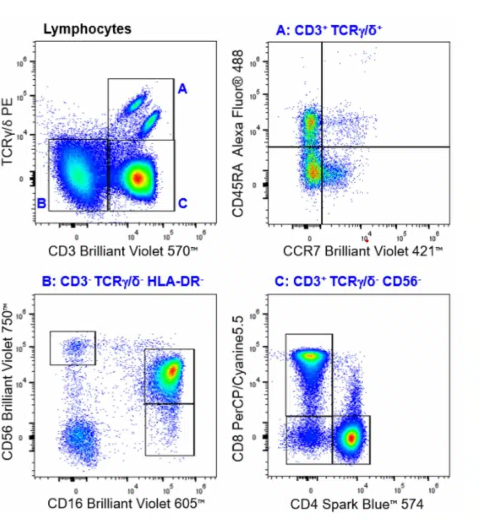 Human peripheral blood mononuclear cells were stained with the Human General Phenotyping (26c) panel. γ/δ T cells are depicted as TCRγ/δ+ CD3+ cells (A, top right). Multiple NK populations were identified as CD3- TCRγ/δ+ HLA-DR- triple-negative cells (B, bottom left). α/β T cells, defined as CD3+ TCRγ/δ- CD56- cells, are further divided into CD4+ and CD8+ T cell populations (C, bottom right). All data were gated on CD45+ viable single cells within the lymphocyte population.
